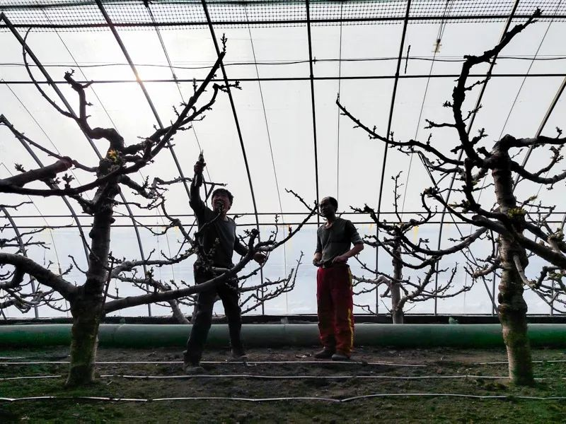 2月14日,位于烏魯木齊高新區(新市區)安寧渠鎮的塞外水鄉生態(tài)農場(chǎng)員工在大棚修剪櫻桃樹(shù)