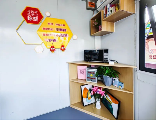 “每天打掃完衛生后,我就會(huì )進(jìn)來(lái)休息休息,喝點(diǎn)熱水,想熱飯還有微波爐,就像家一樣,感覺(jué)特別暖心?!苯?,在友誼路街道澳華社區丑馬一號文創(chuàng )園的蜂享驛站中,作為這里的“??汀?,環(huán)衛工人段等霞對此贊不絕口。