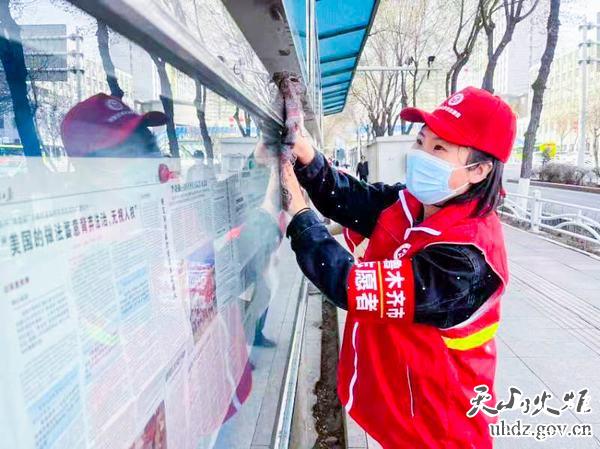 高新區(新市區)新時(shí)代文明實(shí)踐中心志愿者王健在同事的配合下,將閱報欄的玻璃櫥窗抬起,旁邊的同事拿著(zhù)抹布仔細擦拭。