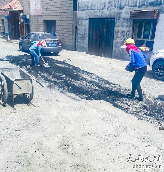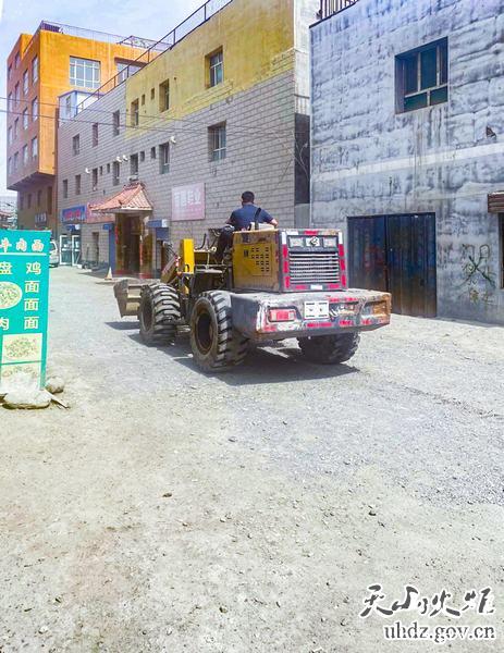 推土機對路面撒料 為切實(shí)解決群眾急難訴求,扎實(shí)為群眾辦實(shí)事、辦好事,湖州路西社區黨支部及“訪(fǎng)惠聚”工作隊充分發(fā)揮黨建引領(lǐng)作用,積極協(xié)調轄區江蘇南通二建施工隊及新疆匯聚路面有限公司,調動(dòng)企業(yè)力量提供機械、人力及原材料供應,同時(shí)發(fā)動(dòng)轄區居民共同參與,在社區主任馬蘭的帶領(lǐng)下對小區坑洼路段進(jìn)行平整。