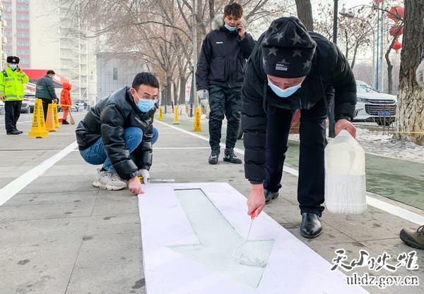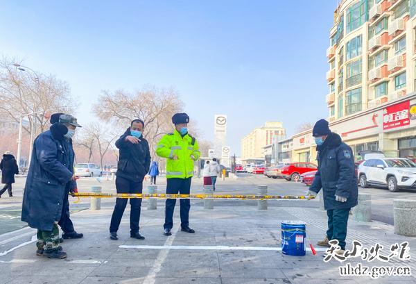 將劃好的未干停車(chē)線(xiàn)用隔離柱隔開(kāi),方便居民通行