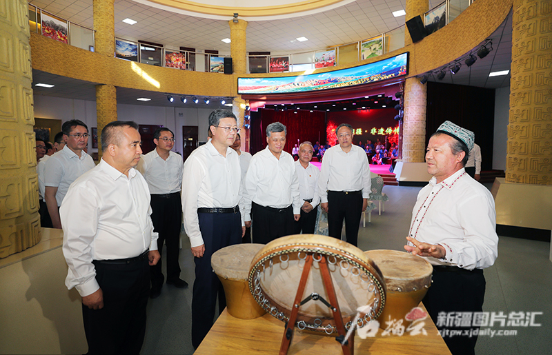 8月27日,陳吉寧、馬興瑞、艾爾肯·吐尼亞孜等在莎車(chē)縣木卡姆文化傳承中心了解文化潤疆工作開(kāi)展情況。石榴云/新疆日報記者 崔志堅攝
