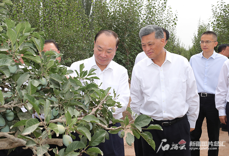 7月10日,黃坤明、馬興瑞在伽師縣新梅種植示范點(diǎn)實(shí)地了解新梅種植情況。石榴云/新疆日報記者 崔志堅攝