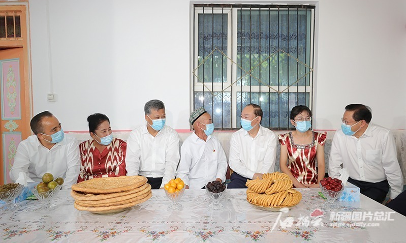 7月10日,黃坤明、馬興瑞、王偉中、艾爾肯·吐尼亞孜,來(lái)到伽師縣英買(mǎi)里鎮拉依力克村看望賽買(mǎi)提·依斯馬依力一家。石榴云/新疆日報記者崔志堅攝