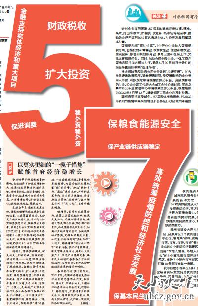 57項具體措施涉及9個(gè)方面,包括財政稅收、金融支持實(shí)體經(jīng)濟和重大項目、擴大投資、促進(jìn)消費、穩外貿穩外資、保糧食能源安全、保產(chǎn)業(yè)鏈供應鏈穩定、?;久裆?、高效統籌疫情防控和經(jīng)濟社會(huì )發(fā)展等。