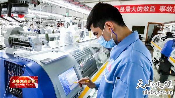 新疆天山紡織服裝有限公司工人在電腦橫機車(chē)間操控機器紡織服裝