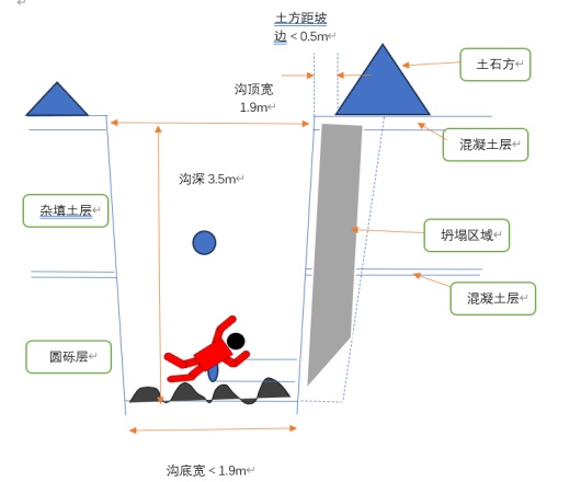 2. 施工作業(yè)管溝深度3.5m,管溝東側有緩坡通道,坍塌后管溝寬1.9—2.5m,管溝長(cháng)8.2m。坍塌面積約4.9m*2.5m。土石方堆高1—1.7m,與管溝距離小于0.5m。