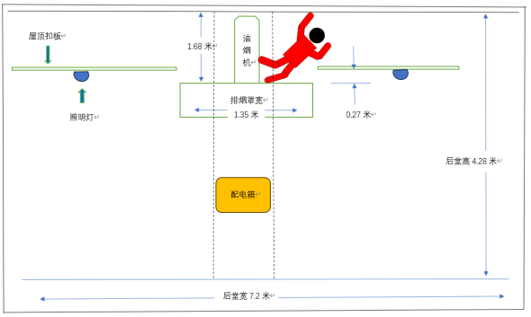 4、后堂長(cháng)21.3米,寬7.2米,高4.28米,排風(fēng)罩底面(接燈作業(yè)面)到屋頂距離1.68米,油煙機排風(fēng)罩長(cháng)10.5米,寬1.35米,作業(yè)面至屋頂扣板距離0.27米。