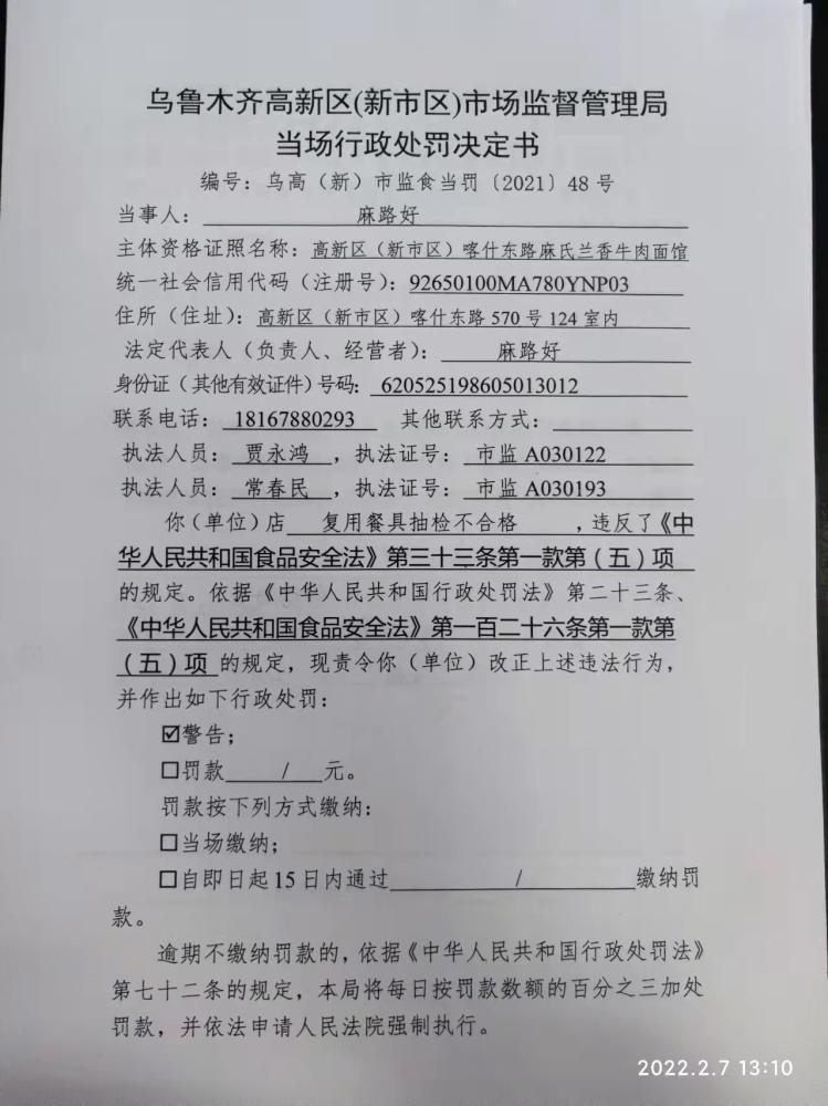 《當場(chǎng)行政處罰決定書(shū)》文號:烏高(新)市監食當罰〔2021〕48號。