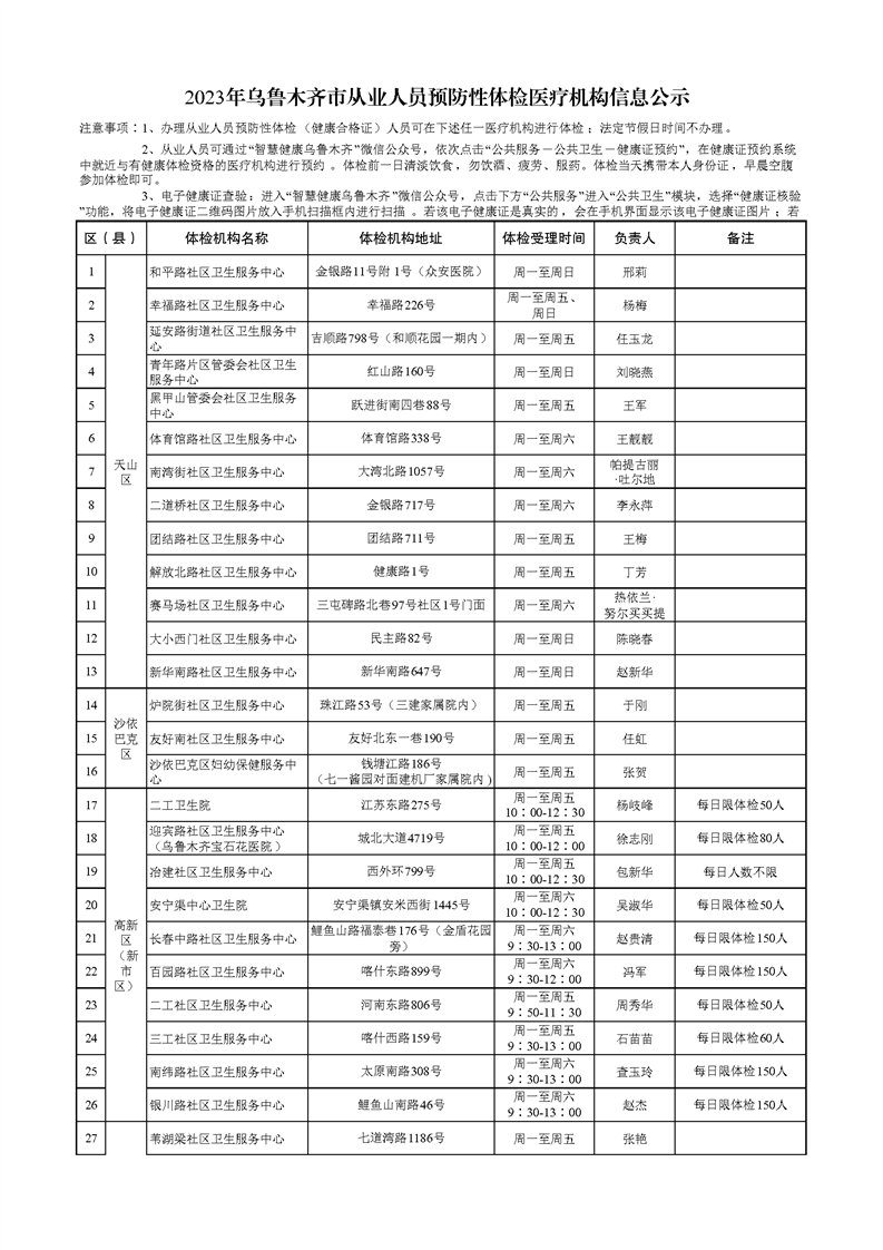 2023年烏魯木齊市從業(yè)人員預防性體檢醫療機構信息公示
