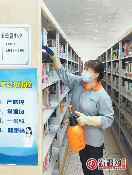 在新疆圖書(shū)館,工作人員用消毒液對公共區域開(kāi)展消殺,角角落落都不放過(guò)。