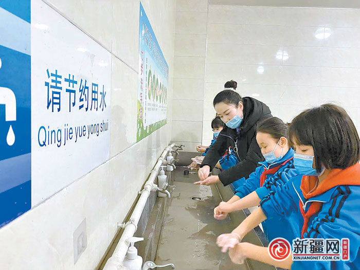 3月23日,烏魯木齊市第109中學(xué),二年級(3)班班主任老師張莉莉和同學(xué)們一起用“七步洗手法”洗手。 (記者王暢彤攝)