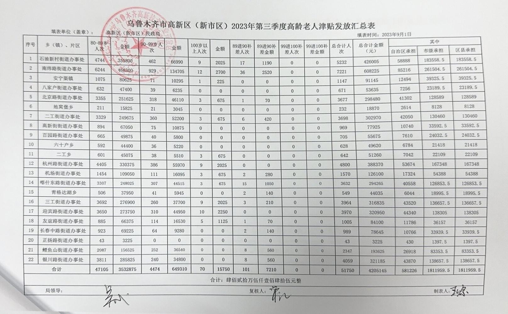 高新區(新市區)2023年第三季度高齡老人津貼發(fā)放匯總表