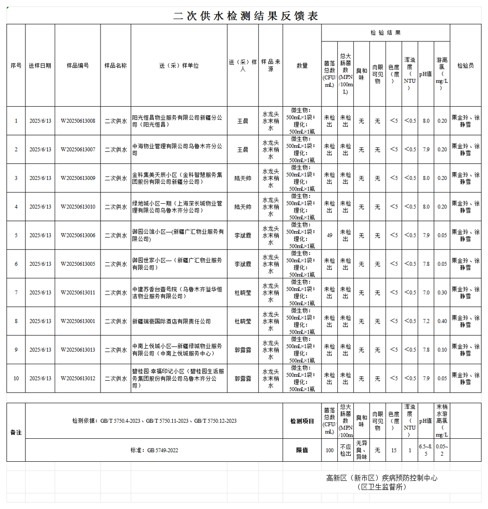 新市區二次供水+水質(zhì)檢測反饋表2025.6.15
